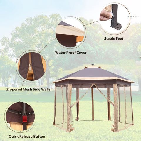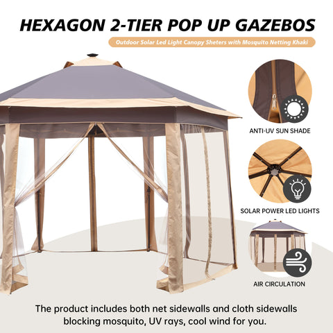 Ainfox 12'x12' Hexagonal Outdoor 2-Tier Pop up Gazebos Canopy with Solar Led Light Sheters with Mosquito Netting for Patio, Lawn, Garden, Khaki